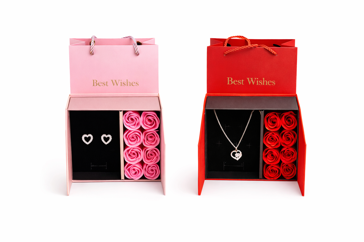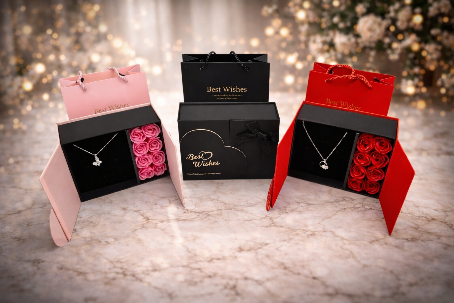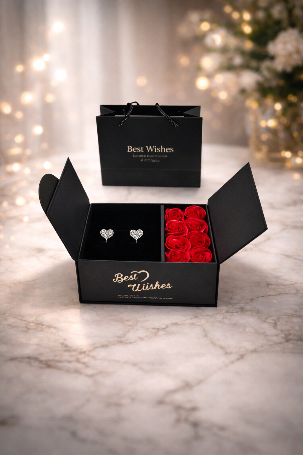 💝 Cutie cadou "Best Wishes" cu pandantiv/cercei/bratara din argint, trandafiri parfumați și pungă elegantă.