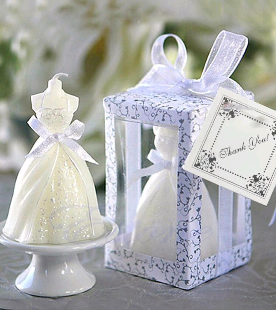 Lumânare Mărturie Rochie de Mireasă. Detaliu elegant cu sclipici și fundă. Cutie cadou inclusă cu etichetă "Thank You!".