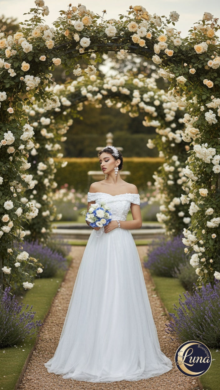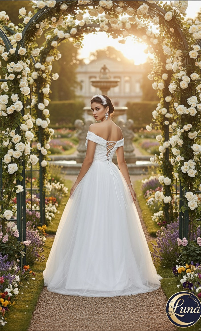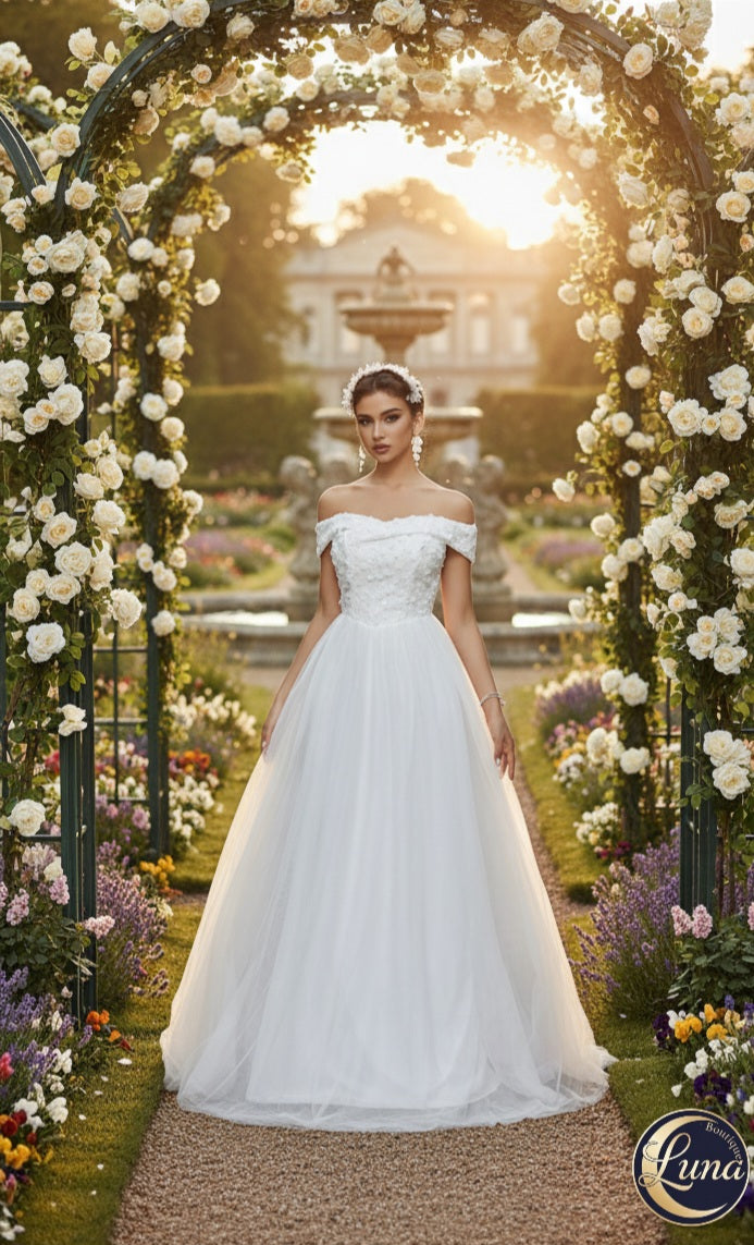 Eleganță regală cu o notă de romantism! Această rochie A-line are un corset spectaculos cu aplicații florale 3D și umeri dezgoliți. Fusta amplă din tul asigură un efect de vis.